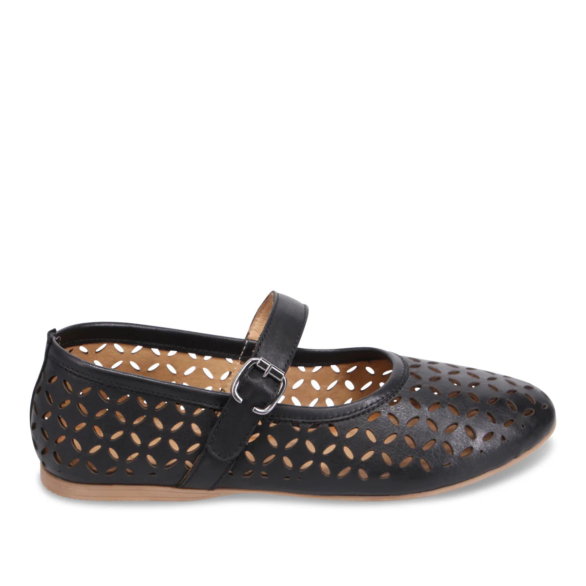 Who can't get enough of a big retro buckle? Brittany! This flat is an open-side style, with a dressy strap...