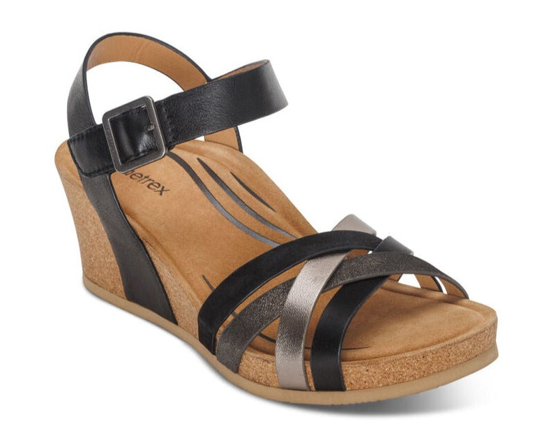 Experience the perfect blend of fashion and support with the Noelle. These wedges feature elegant crossband detailing and provide essential arch support for stability and pain relief. Offering a customized fit with an adjustable hook & loop closure and stretchy gore material, they’re crafted from premium genuine leather for both style and comfort.
