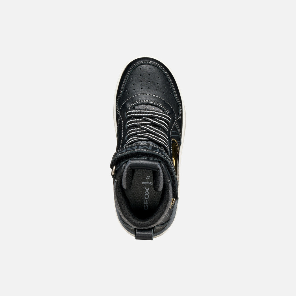 Sneaker for boys with a comfortable stylish design that takes its cues from the famous superhero Batman and was devised under the partnership between Geox and the Warner Bros. This black and gold version of Washiba has been crafted from fabric and a leather-effect material, and features distinctive details that evoke the iconic cartoon character. It is the perfect solution for everyday routine, and will bring a characterful touch to little adventurers’ casual-sporty outfits.